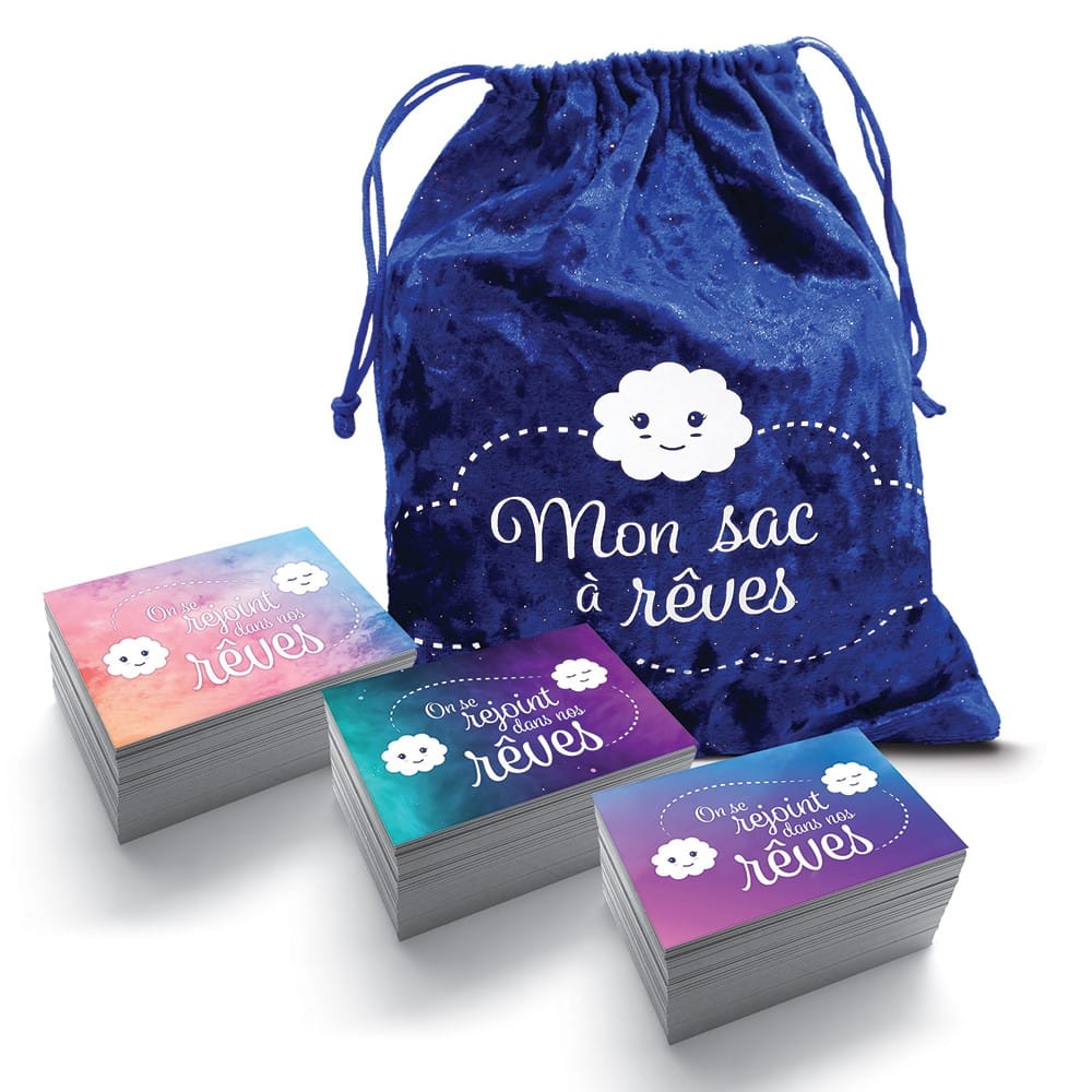 - Avant le dodo, l’enfant termine sa routine en pigeant une carte dans le sac, qui révélera le lieu où son parent et lui se rejoindront dans un rêve. À l’aide de son parent, il lit la phrase qui figure sur la carte. Puis c’est le temps de laisser place à la créativité en imaginant ensemble les paysages, les animaux, les bâtiments, les vêtements, etc., selon la destination pigée. Il n’y a aucune limite à l’imagination! Et quand c’est rigolo, c’est encore mieux!