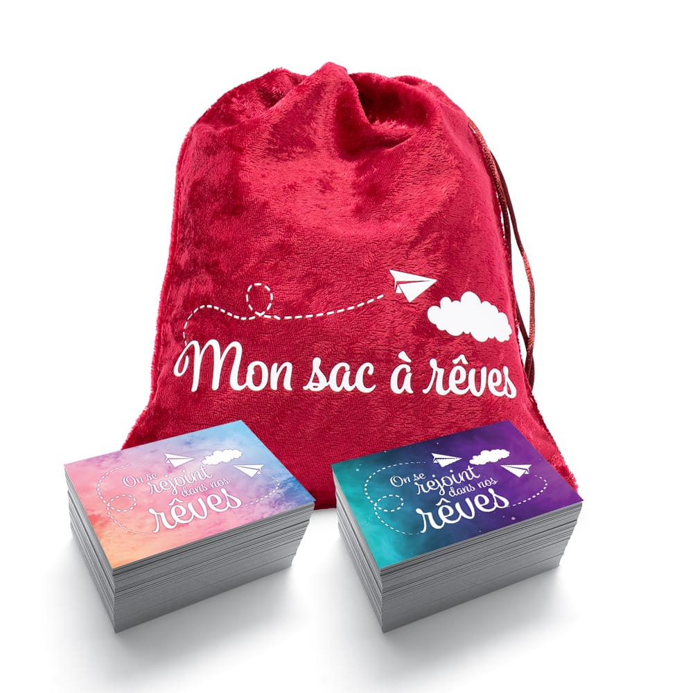 - Avant le dodo, l’enfant termine sa routine en pigeant une carte dans le sac, qui révélera le lieu où son parent et lui se rejoindront dans un rêve. À l’aide de son parent, il lit la phrase qui figure sur la carte. Puis c’est le temps de laisser place à la créativité en imaginant ensemble les paysages, les animaux, les bâtiments, les vêtements, etc., selon la destination pigée. Il n’y a aucune limite à l’imagination! Et quand c’est rigolo, c’est encore mieux!